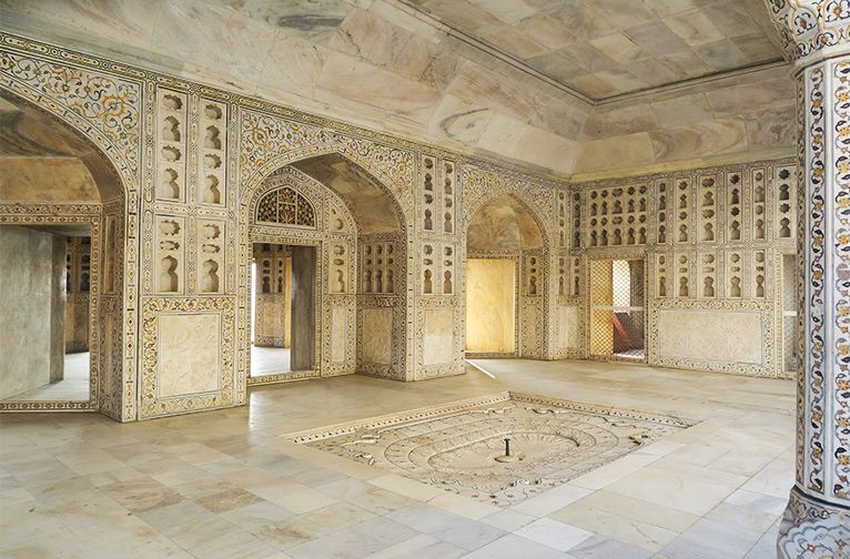Covering the interior walls, arches and ceiling, tiny shimmering mirrors create a mesmerising effect by reflecting multiple images of all who enter this double-chambered structure northeast of the Khas Mahal in Agra Fort. The beautifully crafted asymmetrical floral and geometric motifs add a piquant charm to the glittering mosaic that brightens the chamber and adds a fine elegance to its interiors.