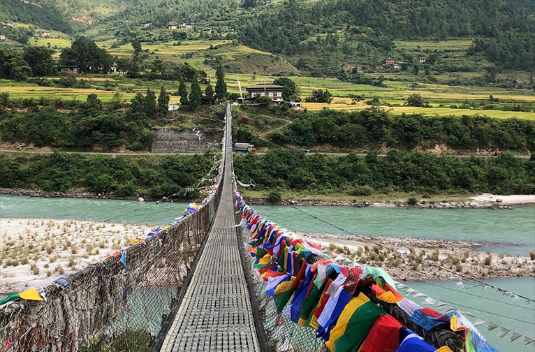 Rejoignez d'autres amateurs d'aventure pour une promenade sur le pont suspendu datant de 1300 ans, qui enjambe les eaux troubles des rivières Thimphu et Paro qui se rejoignent. Les rampes des deux côtés du pont, qui relie le temple de Tachog à la vallée, sont bordées de drapeaux de prière aux couleurs vives.