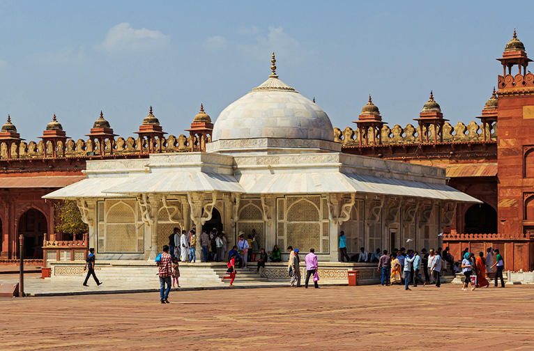 En approchant de la ville fortifiée de Fatehpur Sikri, vous ne pourrez pas manquer la façade de marbre blanc immaculé du magnifique sanctuaire qu'Akbar a fait construire pour honorer le saint soufi qui l'a béni en lui donnant un héritier pour son trône. Pour créer un lien plus durable avec le saint soufi, Akbar a planifié une toute nouvelle ville autour de son sanctuaire. Fatehpur Sikri a servi de toute nouvelle base administrative à Akbar, tout en restant profondément liée à l'ancien bastion moghol d'Agra.