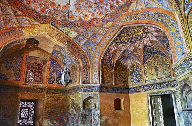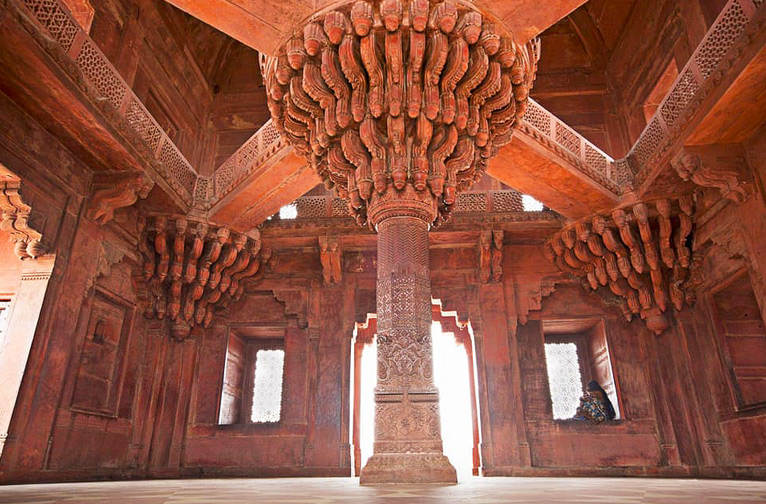 Dirigez-vous vers le nord jusqu'au Diwan-i-Khas (salle d'audience privée), également connu sous le nom de "Maison des joyaux". Le point central est l'étonnant pilier central, abondamment sculpté de bandes de motifs géométriques et floraux. Trente-six consoles serpentines soutiennent la plate-forme circulaire à partir de laquelle l'empereur intronisé tenait sa cour avec les invités spéciaux ; elle est reliée à chaque coin du bâtiment au premier étage par quatre passerelles en pierre. L'un des débats les plus importants qui se sont déroulés ici concernait le désir d'Akbar de mettre en place une politique interconfessionnelle afin de garantir l'harmonie dans son royaume. Des représentants de différentes religions ont été invités à partager les attributs les plus convaincants de leur foi à cette fin. De ces discussions est née la légendaire Din-i-Ilahi d'Akbar, la nouvelle foi syncrétique enracinée dans les idéaux mystiques soufis de Sulah-i-Kul, qui signifie "paix avec tous" ou "paix universelle". Pour Akbar, il s'agit d'une coexistence harmonieuse entre les différentes religions. Ce concept interconfessionnel lui convenait parfaitement, car la noblesse moghole était composée d'un mélange d'Iraniens, de Turanis, d'Afghans, de Rajputs et de Deccanis. Sulah-i-Kul a accordé la liberté d'expression à toutes les religions, mais aucune atteinte n'a été portée à l'empereur ou aux autres religions.
