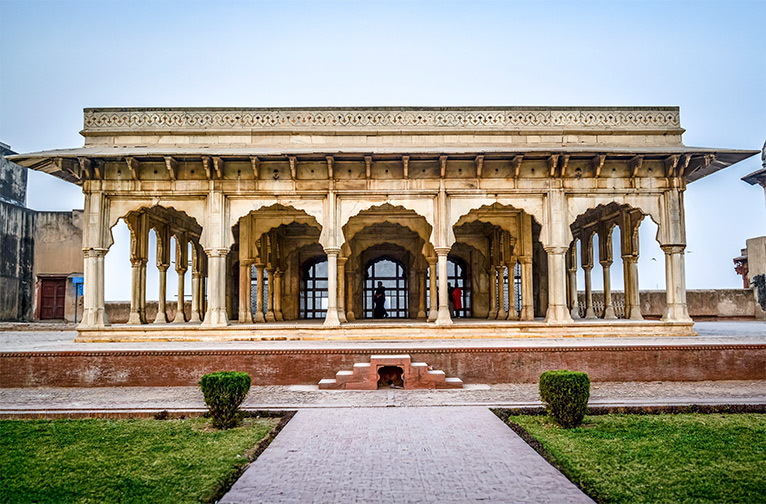 Le Diwan-i-Am (salle d'audience publique) est une petite salle surélevée qui servait de siège à l'empereur, d'où il écoutait les pétitions de ses sujets et rendait la justice au public. Elle est directement reliée au complexe du palais impérial qui s'étend le long d'une cour massive.