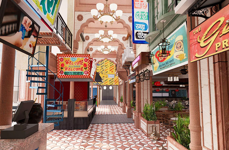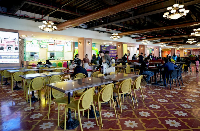 Pour faciliter votre voyage culinaire, l'aire de restauration est divisée en quatre zones distinctes : Sunehri Nagri, Laal Bagh, Neel Nagar et Pannapuri. Sunehri Nagri est une plaque tournante pour les desserts et les magasins de sucreries. Une ruelle étroite, l'Itihaas Gali, mène à Pannapuri, un centre de chaînes de restaurants mondialisées. Pannapuri est relié à Neel Nagar, où l'on trouve des chaînes de restaurants internationaux, des restaurants moghols et deux chaînes végétariennes. De là, suivez la petite ruelle jusqu'à Laal Bagh, où se trouvent de nombreuses autres chaînes de restaurants internationaux.