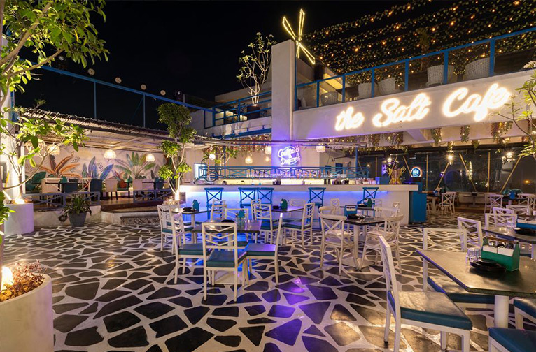Le Salt Cafe Kitchen & Bar est un point d'eau populaire auprès des jeunes et des personnes agitées, c'est un endroit animé de la ville. La terrasse, avec son assemblage d'aqua grecs dans les tons de bleu et de blanc, offre une vue imprenable sur le Taj Mahal. Les pâtes au poulet au beurre figurent parmi les plats les plus originaux. La carte propose également des dimsums et des tikkas fondants.