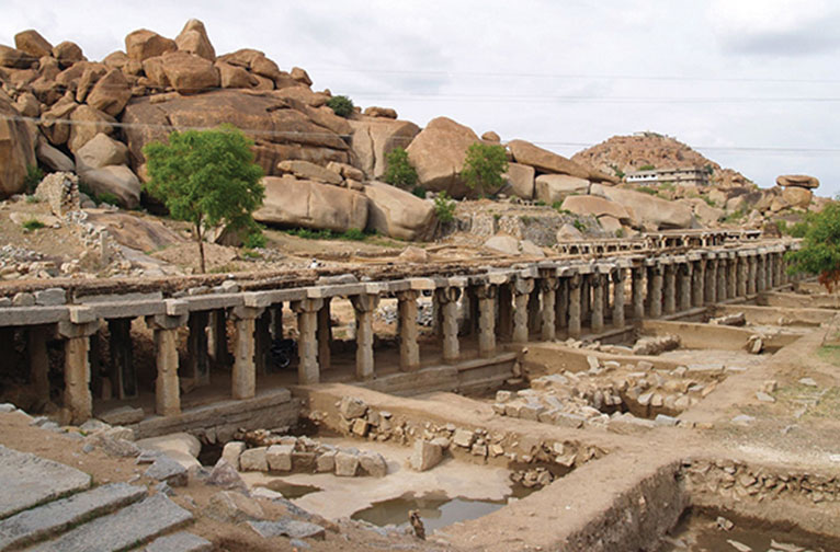 Un sentier du patrimoine permet de découvrir la plupart des sites importants de ce site protégé du patrimoine mondial de l'UNESCO, dont la zone centrale s'étend sur 42 km². Cette zone comprend plus de 1 600 vestiges, dont des forts, des éléments riverains, des complexes royaux et sacrés, des temples, des salles à piliers, des écuries, etc. Les espaces les plus célèbres sont le centre sacré, le noyau urbain, les quartiers islamiques, Kamlapura et Anegundi.