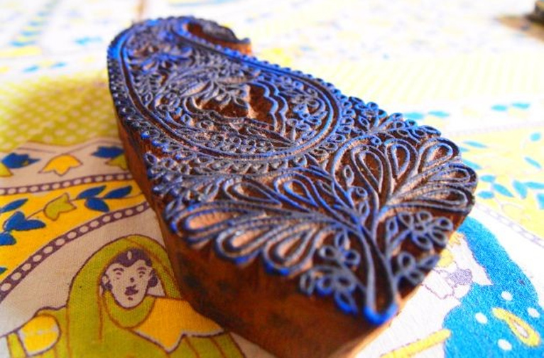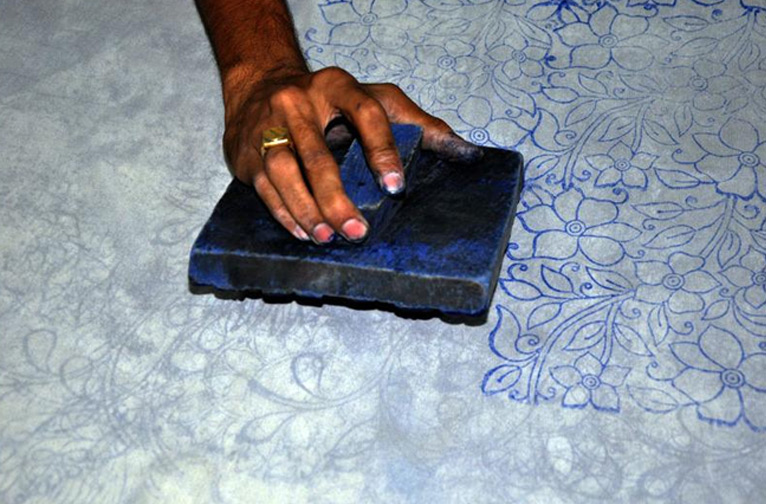 Impression de blocs : Le motif de broderie est imprimé sur le tissu à l'aide d'une encre lavable (neel/indigo ou teinture safeda).