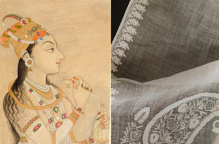 Il existe un lien encore plus ancien avec cette broderie blanc sur blanc, qui remonte à l'époque du célèbre roi Harsha (590-647 de notre ère). Un document encore plus ancien, datant du IIIe siècle avant J.-C. et rédigé par Megasthanes, l'ambassadeur grec de Seleucus I Nicator auprès de l'empereur Chandragupta Maurya, mentionne la popularité de la "mousseline à fleurs" auprès de ses courtisans.