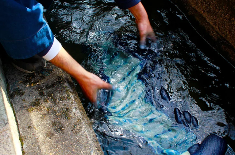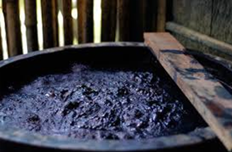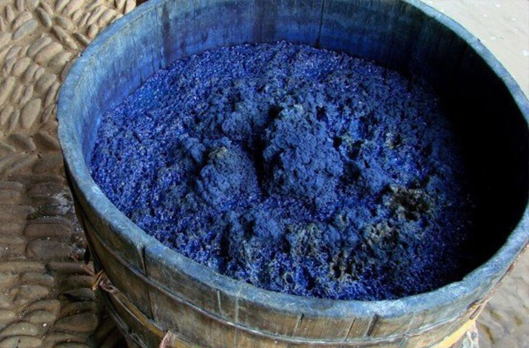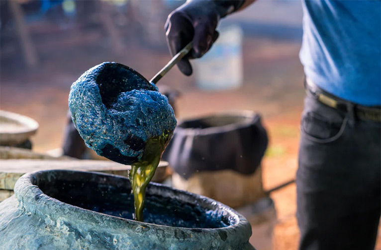 Après leur récolte, les feuilles de l'indigotier touffu sont trempées dans des cuves et alourdies par des rondins de bois, puis laissées à fermenter pendant la nuit. À l'aube, les feuilles sont retirées. Transférée dans une autre cuve, l'eau verdâtre s'oxyde en trois heures au maximum en étant exposée à l'air par un barattage vigoureux, ce qui provoque une transformation magique en aspirant avidement le pigment bleu libéré par les feuilles. Le résultat est l'Indican, une solution bleue soluble dans l'eau. La boue bleue qui reste au fond de la cuve est écumée, filtrée, pressée, séchée au soleil et transformée en gâteaux.