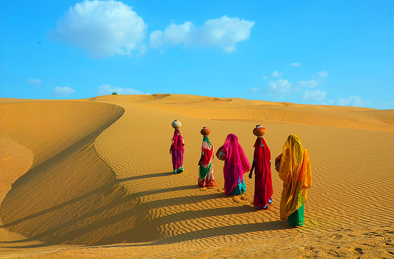 Partez pour l'avant-poste désertique de la ville royale de Jaisalmer, mondialement connue pour son "Sona Kila" ou "Fort d'or". Cette fantastique ville fortifiée se visite de préférence en hiver, car son emplacement dans les sables chauds du désert du Rajasthan peut être très désagréable pour les voyageurs pendant les étés rigoureux, avec des températures qui atteignent des sommets. Jaisalmer offre une merveilleuse occasion de passer une nuit à la belle étoile sur les dunes de sable, au son des chanteurs et danseurs folkloriques, avec un dîner composé d'une multitude de spécialités locales. En ville, passez des moments magiques à vous imprégner des riches nuances de ses merveilles architecturales, telles que les havelis (manoirs) sculptés et les temples. Dans les bazars d'antiquités, faites le plein d'articles en cuir, de vêtements brodés à la main, de tissus imprimés au bloc et au batik, de grès, etc. Si vous êtes ici à la mi-février, un événement à ne pas manquer est le festival du désert de Jaisalmer, qui se tient pendant trois jours (du 22 au 24 février) dans les dunes de Sam.