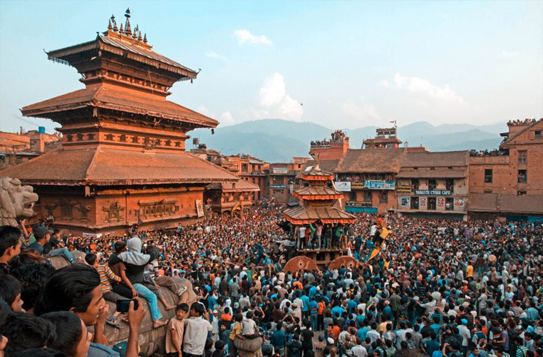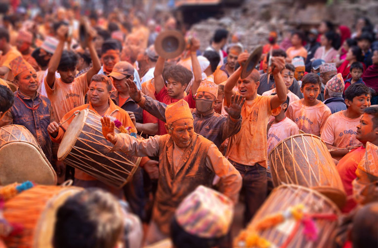 Plongez dans le joyeux adieu à la vieille année et accueillez la nouvelle année. Des milliers de joyeux lurons descendent dans les rues de Bhaktapur pour célébrer le Nouvel An népalais.