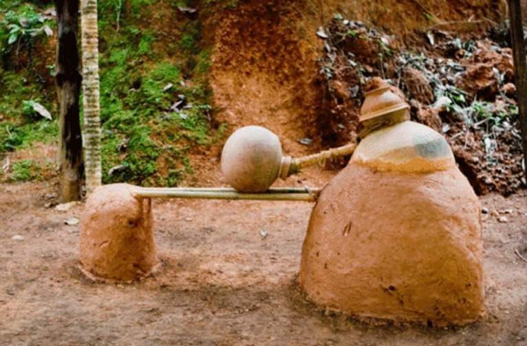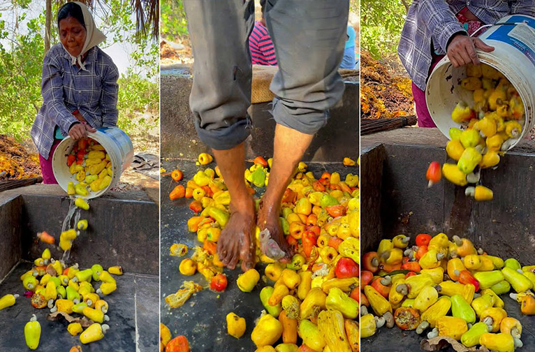 Traditionnellement, les pommes de cajou épépinées étaient jetées dans une zone de broyage en forme de bassin appelée "colmi". Le piétinement des noix de cajou permettait d'en libérer le jus, un peu comme on le fait avec le raisin pour la vinification ! Le processus de foulage est devenu un peu plus sophistiqué en étant remplacé par un pressoir appelé "pinjre" ou cage.