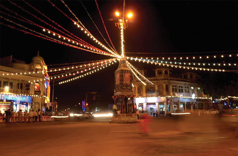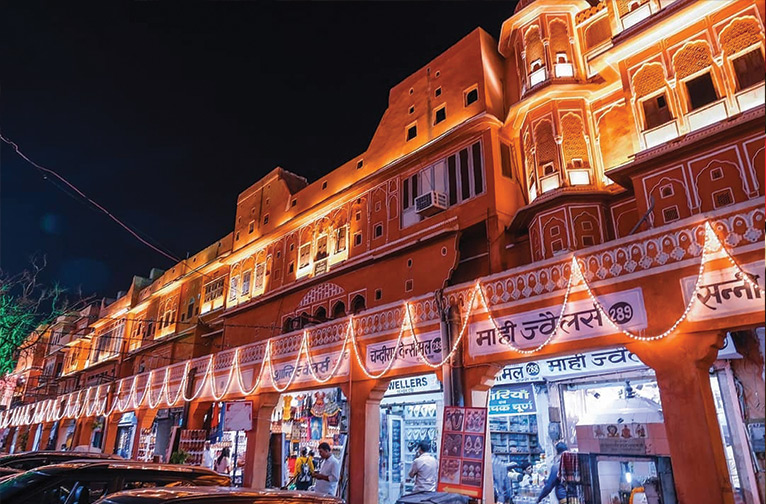 MI Road, le cœur battant de la ville, se pare chaque année de son costume de Diwali, ce qui lui vaut le surnom local de "The Strip", à l'instar du Las Vegas étincelant des États-Unis. Essayez d'arriver tôt avant que les foules ne descendent. Dans la ville fortifiée, Johri Bazaar, Bapu Bazaar et Nehru Bazaar sont également incontestables pour leurs illuminations féeriques. Dans le quartier de Chaura Rasta, même les ombres de certains endroits sombres sont chassées cette nuit par les lumières vives qui illuminent toute la rue. Sur Tonk Road, le bâtiment du bijoutier Motisons fait parler de lui pour sa somptueuse façade scintillante.