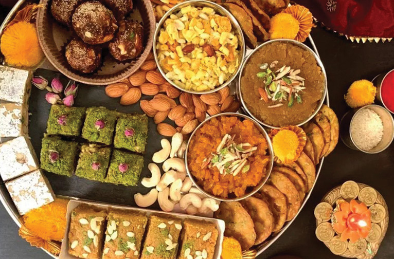 Diwali, c'est aussi l'occasion de se régaler et d'assouvir sa gourmandise en dégustant des délices traditionnels faits maison, comme le mawa kachori, le til ke laddo, le gonth ke ladoo, le piste ke launj, le moti pak, le pheni, le sohan papdi, le besan barfi, le jalebi, le shakkarpare et bien d'autres délices alléchants pour le palais