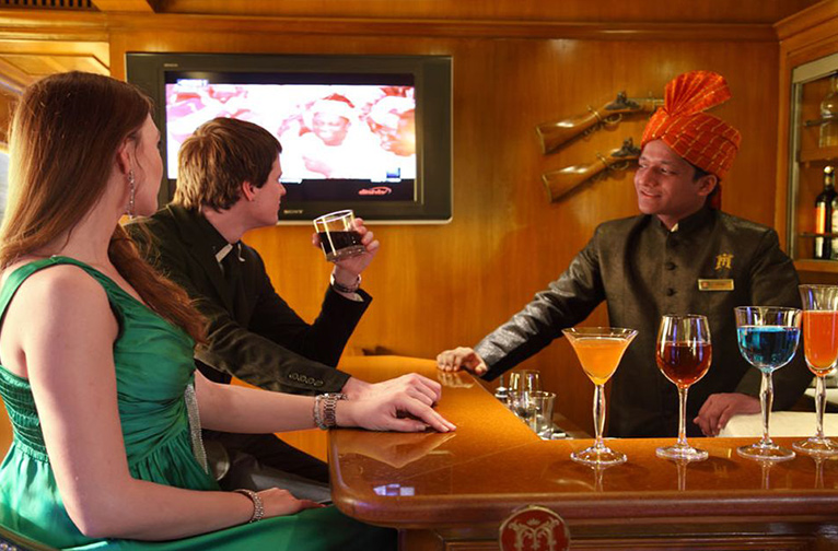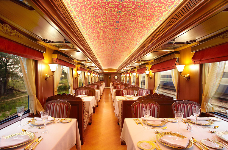 Vous pouvez dîner et boire du vin comme un roi dans les deux voitures-restaurants, le Rang Mahal (Colour Palace) et le Mayur Mahal (Peacock Palace). Dans ce cadre somptueux, vous mangerez sur de la porcelaine de Limoges dorée à l'or fin et boirez vos boissons dans des verres en cristal Swarovski taillés à la main. Même les couverts portent le monogramme royal "M". Le Safari Bar, bien approvisionné, et le salon du Rajah Club sont des points d'eau très appréciés des hôtes à bord.