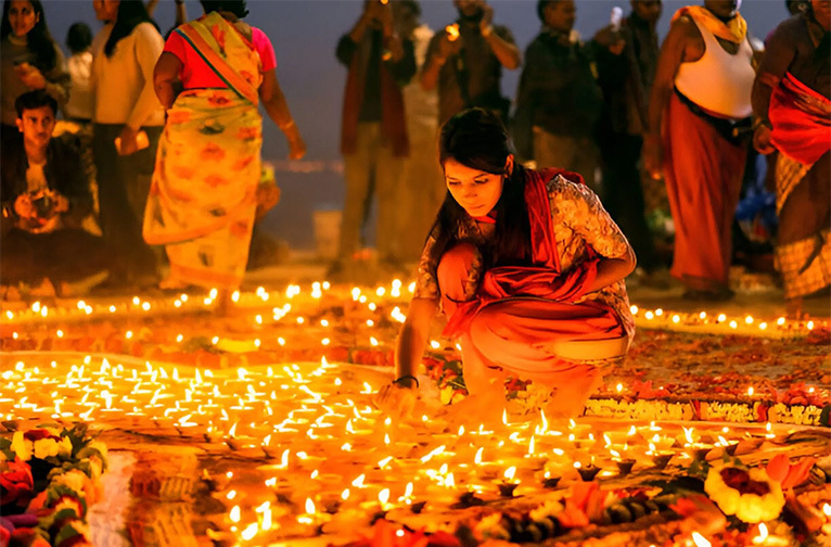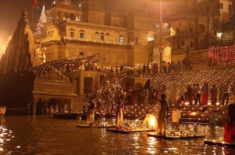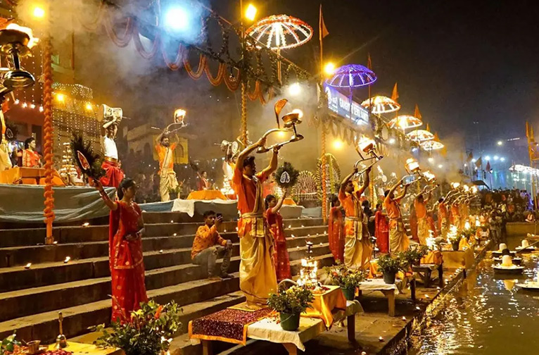 L'une des expériences les plus émouvantes est l'aarti élaboré sur le Gange, qui se déroule au coucher du soleil sur les rives du fleuve ; ce rituel, qui a lieu toute l'année, est propulsé par une énergie encore plus puissante, canalisée par la dévotion collective de l'immense rassemblement qui se tient sur le ghat pendant Diwali. Au total, 24 prêtres brahmanes et 24 jeunes filles accomplissent ce rituel séculaire.
