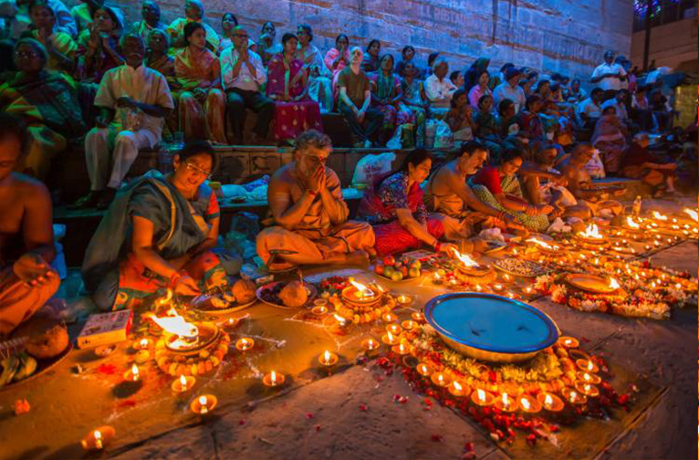 Cette occasion propice est marquée par des rituels spéciaux. Dès les premières heures d'un matin frais et lumineux, les fidèles se pressent sur les ghats pour la traditionnelle baignade de purification (Ganga snan) dans le fleuve sacré. La visite des temples et les offrandes de friandises, de fleurs, de bonbons et d'encens aux dieux pour obtenir leurs bénédictions sont des rituels familiaux. Les aumônes et l'aide aux pauvres sont censées accroître les mérites de chacun aux yeux des dieux. La nuit, des milliers de diyas (lampes en terre cuite) allumées et libérées sur les eaux du Gange scintillent dans un esprit de pure bonne volonté et d'harmonie spirituelle avec le monde. Le jeu des lumières laser ajoute une touche contemporaine à un rituel ancien.