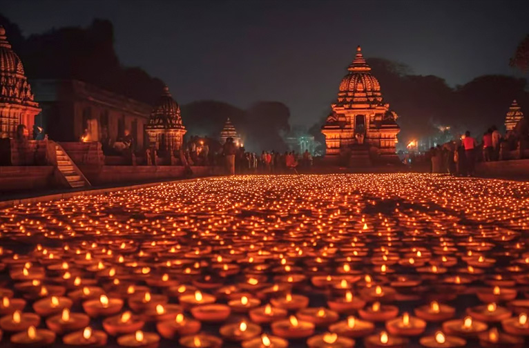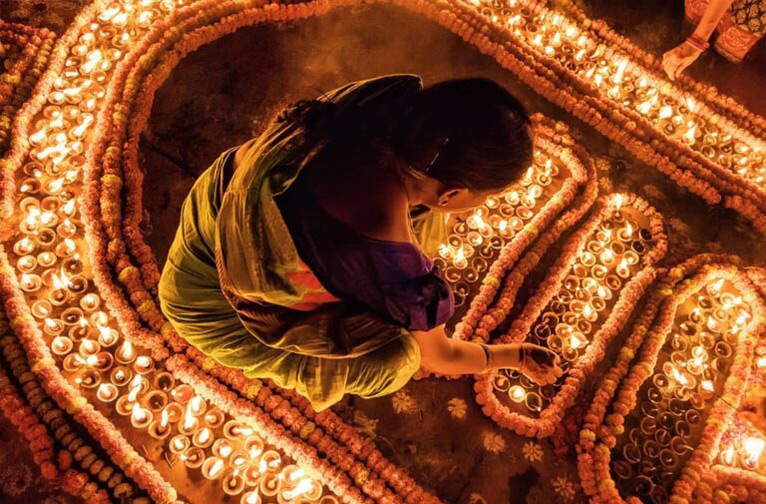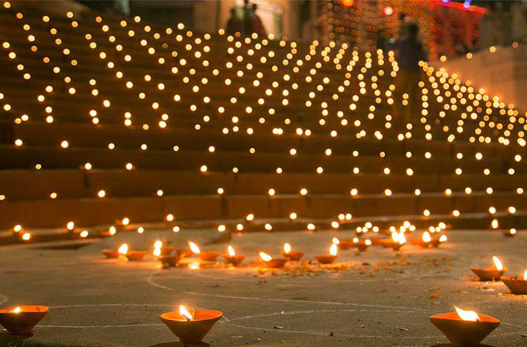 Varanasi brille comme un escalier vers le ciel pour faciliter l'arrivée des dieux. L'embrasement des diyas entre en jeu dès l'apparition de la pleine lune. La façade scintillante du bord du fleuve est un accueil resplendissant pour les divinités qui arrivent sur les ghats sacrés, embrasés par les lumières de milliers de diyas et de magnifiques rangolis floraux dessinés à la main, pour prendre un bain rituel dans le saint Gange avant de participer à l'explosion de célébrations dans les temples et les rues de la ville.
